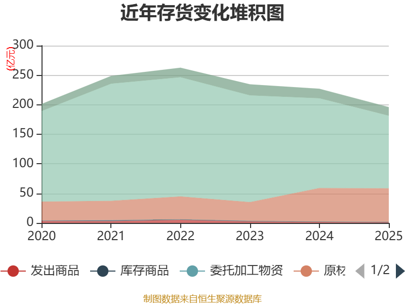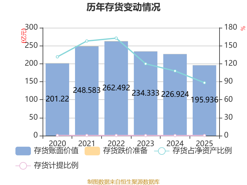 从存货变动来看,截至2025年末,公司存货账面价值为195.94亿元,占净资产的88.23%,较上年末减少30.99亿元。其中,存货跌价准备为4775.16万元,计提比例为0.24%。
