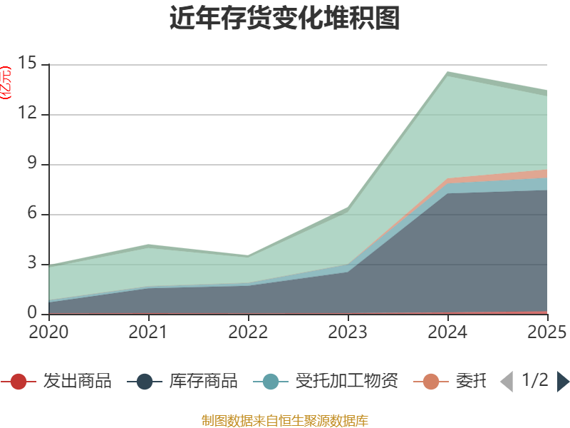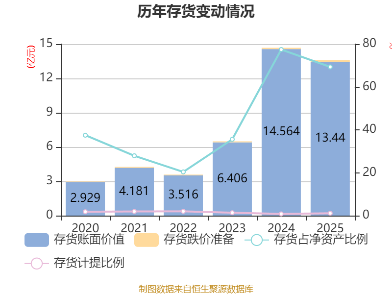从存货变动来看,截至2025年末,公司存货账面价值为13.44亿元,占净资产的69.37%,较上年末减少1.12亿元。其中,存货跌价准备为1468.6万元,计提比例为1.08%。