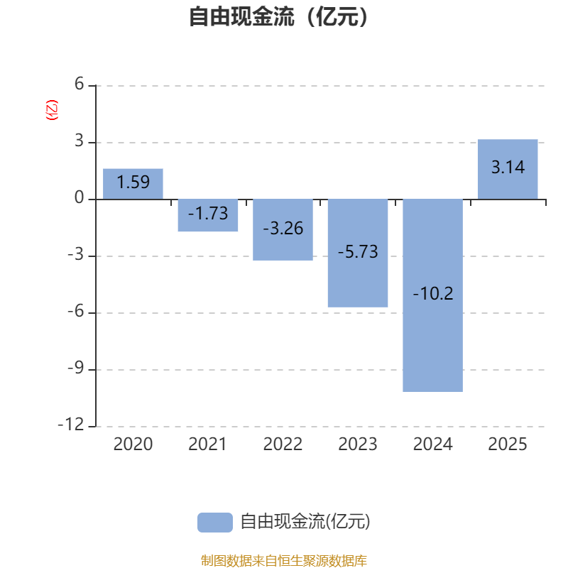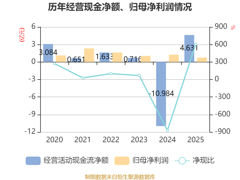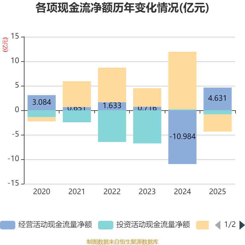 截至2025年,公司经营活动现金流净额为4.63亿元,同比增加15.62亿元;筹资活动现金流净额-3.51亿元,同比减少15.27亿元;投资活动现金流净额-8488.86万元,上年同期为1837.3万元。