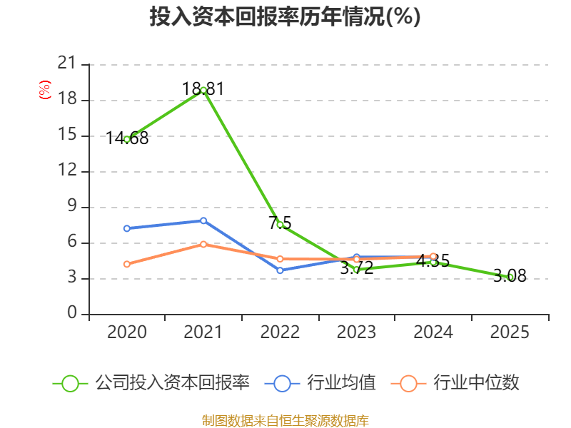 数据显示,2025年公司加权平均净资产收益率为4.03%,较上年同期下降2.81个百分点。公司2025年投入资本回报率为3.08%,较上年同期下降1.27个百分点。