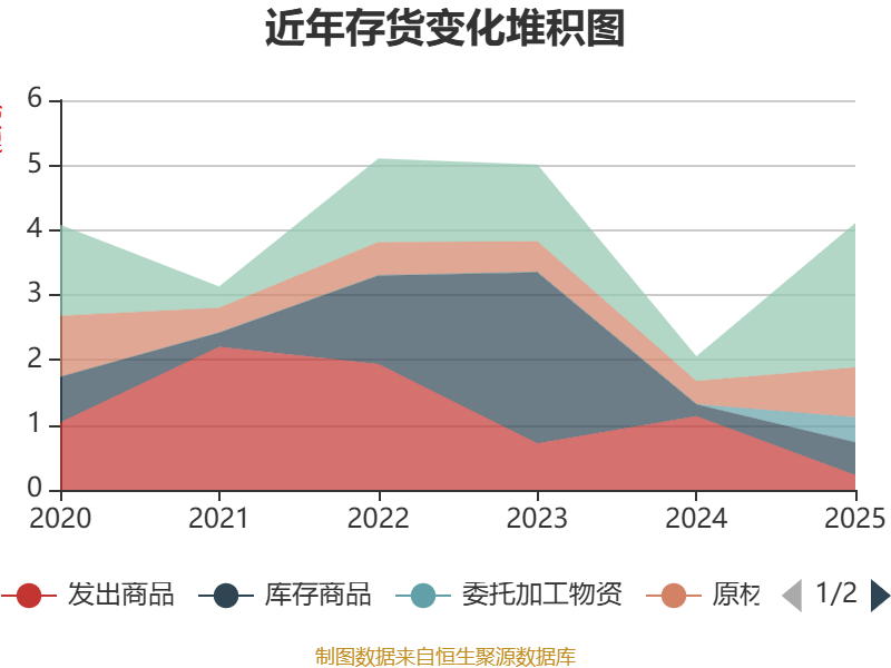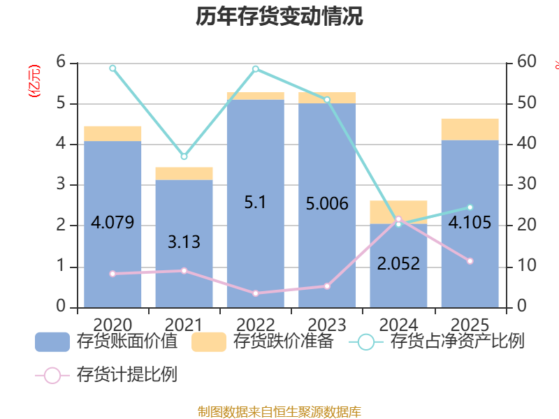从存货变动来看,截至2025年末,公司存货账面价值为4.1亿元,占净资产的24.53%,较上年末增加2.05亿元。其中,存货跌价准备为5251.42万元,计提比例为11.34%。