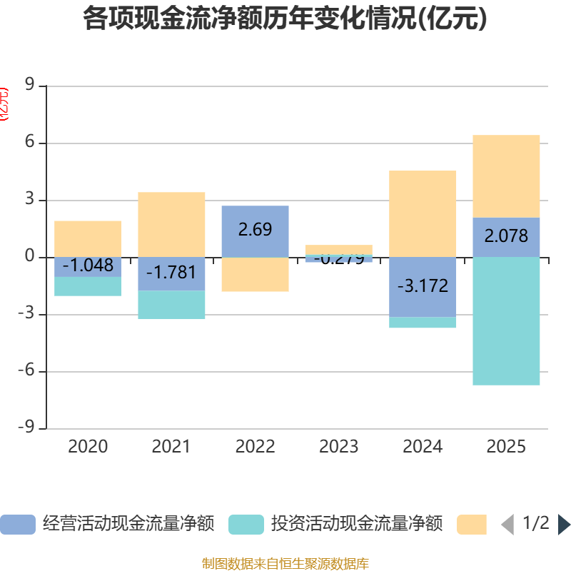 截至2025年,公司经营活动现金流净额为2.08亿元,同比增加5.25亿元;筹资活动现金流净额4.33亿元,同比减少2098.14万元;投资活动现金流净额-6.74亿元,上年同期为-5486.07万元。