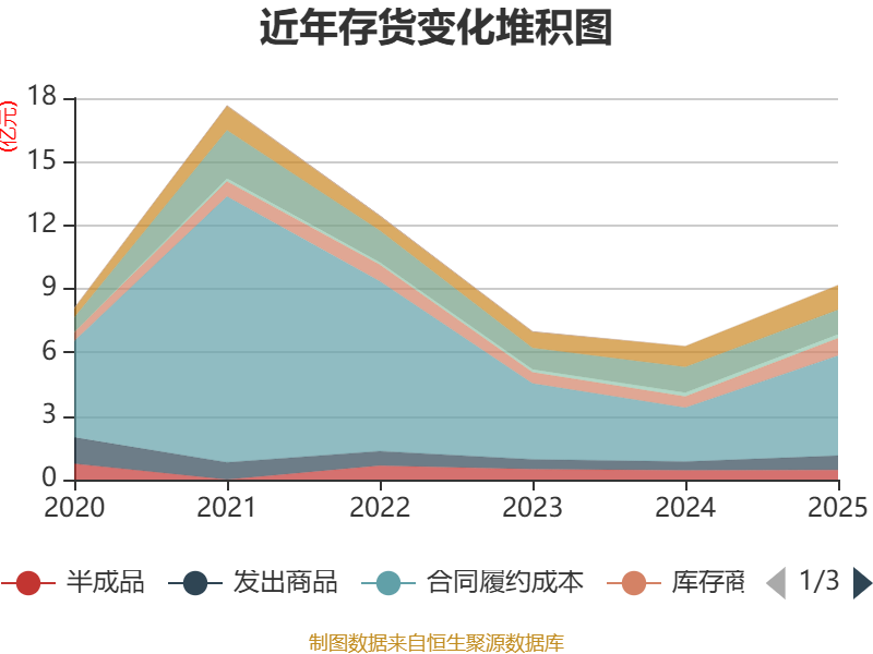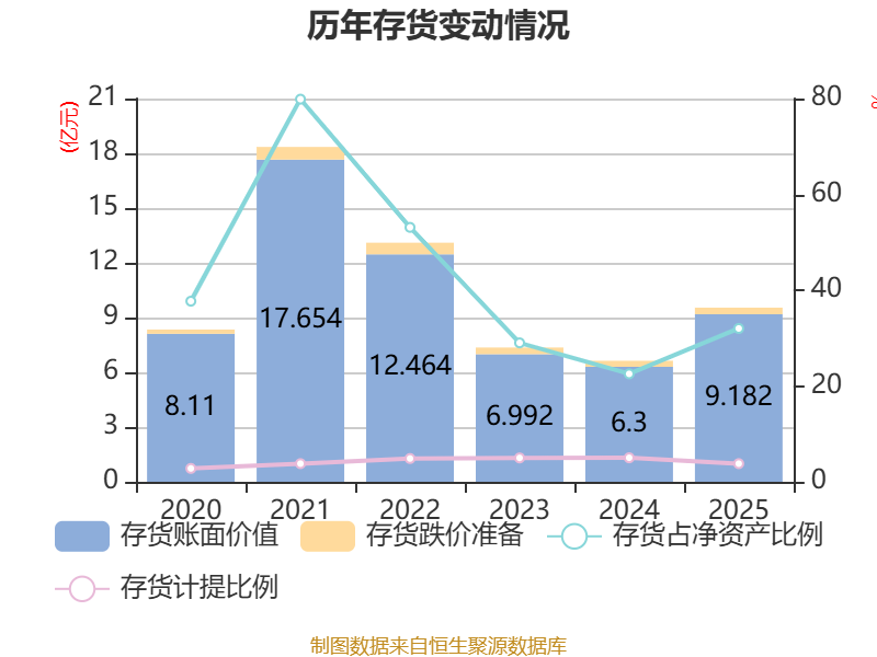 从存货变动来看,截至2025年末,公司存货账面价值为9.18亿元,占净资产的32.01%,较上年末增加2.88亿元。其中,存货跌价准备为3613.41万元,计提比例为3.79%。