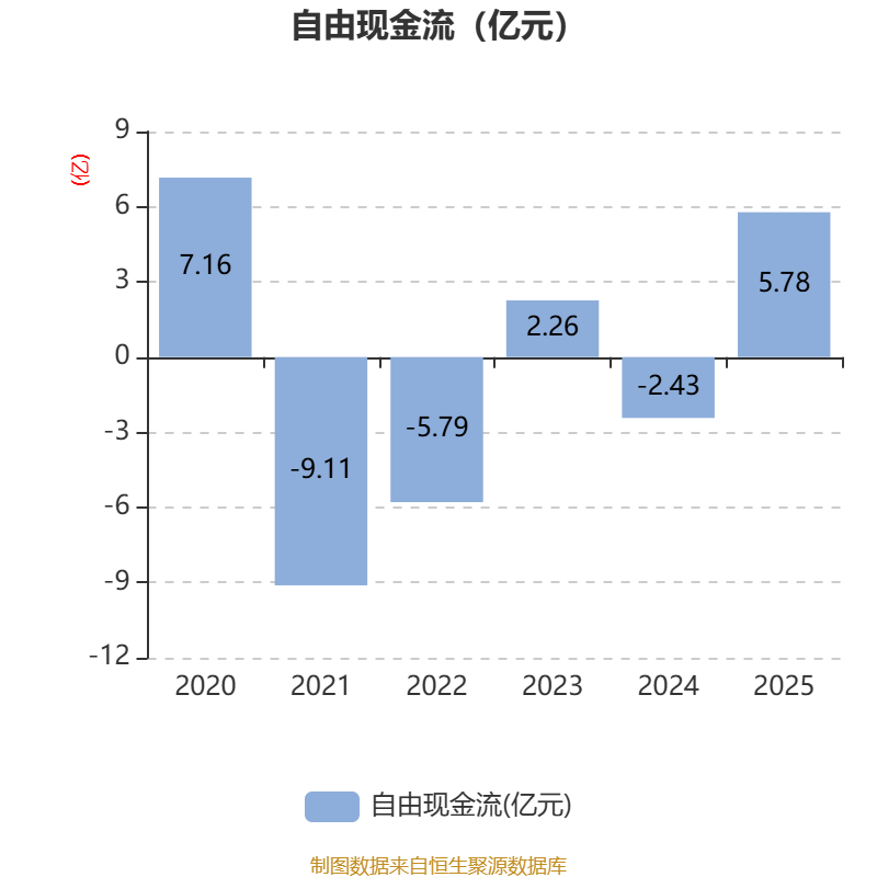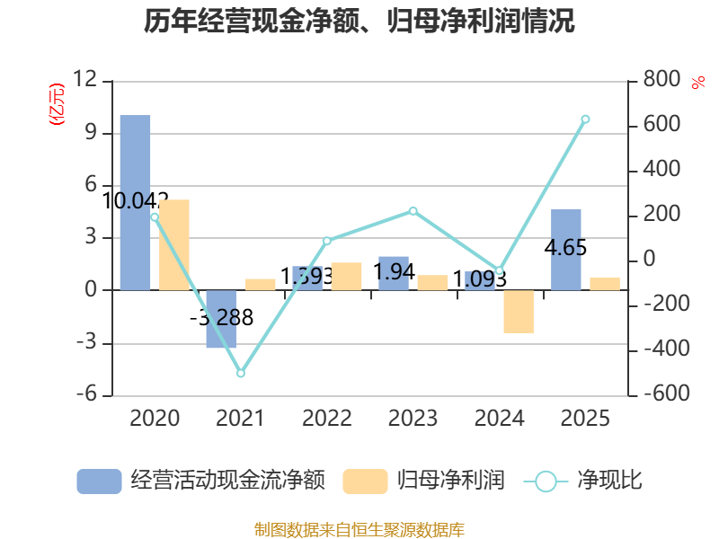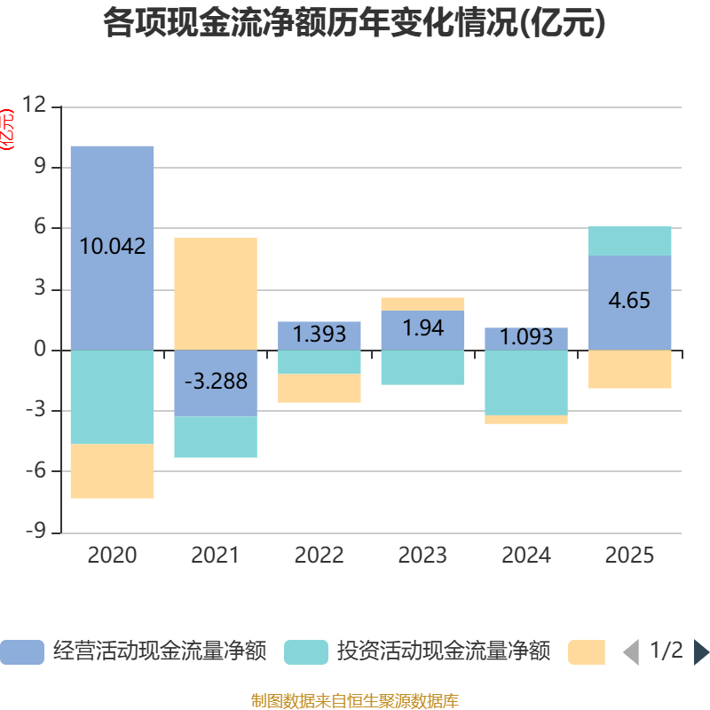 截至2025年,公司经营活动现金流净额为4.65亿元,同比增长325.54%;筹资活动现金流净额-1.89亿元,同比减少1.46亿元;投资活动现金流净额1.44亿元,上年同期为-3.22亿元。