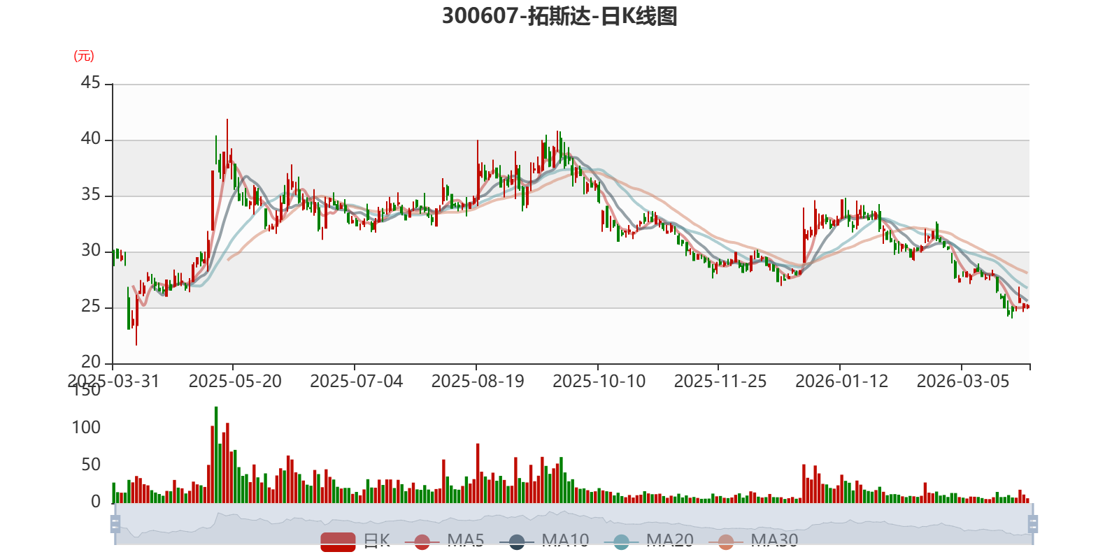 中证智能财讯拓斯达(300607)3月31日披露2025年年度报告。2025年,公司实现营业总收入25.1亿元,同比下降12.59%;归母净利润7387.25万元,同比扭亏;扣非净利润5671.1万元,同比扭亏;经营活动产生的现金流量净额为4.65亿元,同比增长325.54%;报告期内,拓斯达基本每股收益为0.15元,加权平均净资产收益率为2.61%。公司2025年度分配预案为:拟向全体股东每10股派现0.32元(含税)。