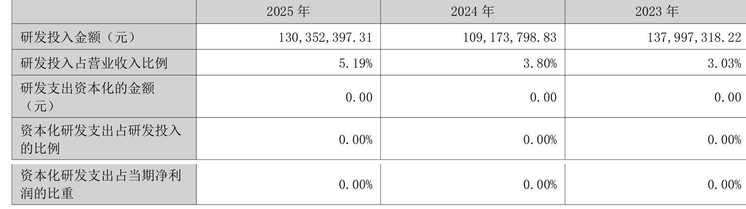 2025年全年,公司研发投入金额为1.3亿元,同比增长19.4%;研发投入占营业收入比例为5.19%,相比上年同期上升1.39个百分点。此外,公司全年研发投入资本化率为0%。