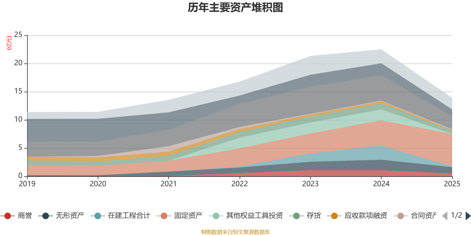 资产重大变化方面,截至2025年末,公司固定资产较上年末增加28.95%,占公司总资产比重上升21.7个百分点;在建工程合计较上年末减少95.13%,占公司总资产比重下降10.22个百分点;其他权益工具投资较上年末减少100%,占公司总资产比重下降8.55个百分点;应收票据及应收账款较上年末减少49.15%,占公司总资产比重下降3.55个百分点。