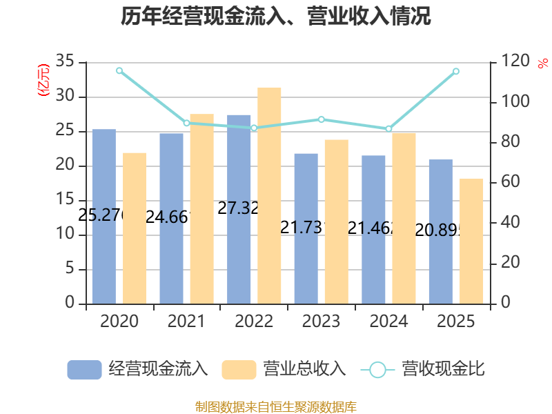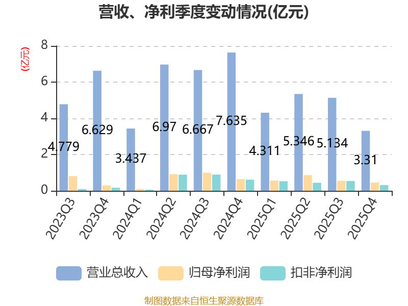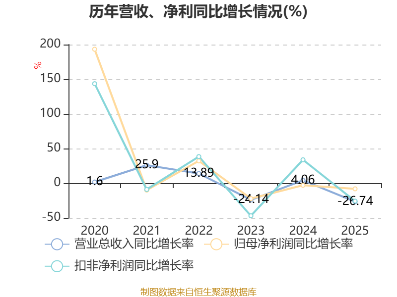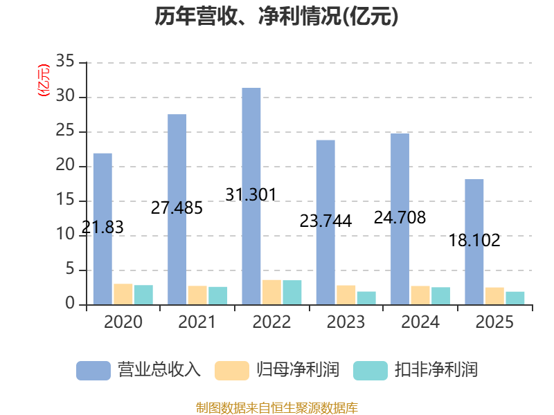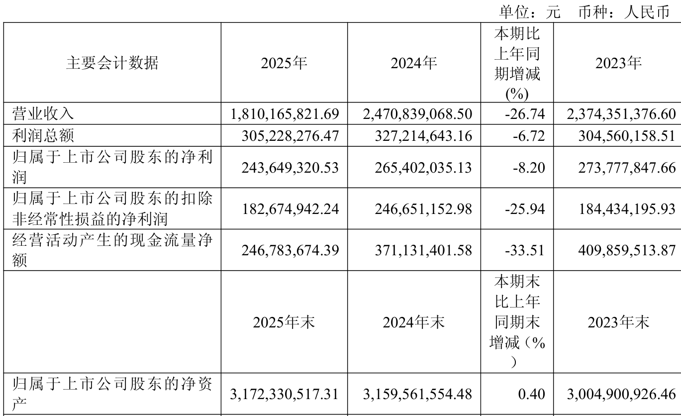 中证智能财讯湖南海利(600731)3月31日披露2025年年度报告。2025年,公司实现营业总收入18.1亿元,同比下降26.74%;归母净利润2.44亿元,同比下降8.20%;扣非净利润1.83亿元,同比下降25.94%;经营活动产生的现金流量净额为2.47亿元,同比下降33.51%;报告期内,湖南海利基本每股收益为0.4394元,加权平均净资产收益率为7.60%。