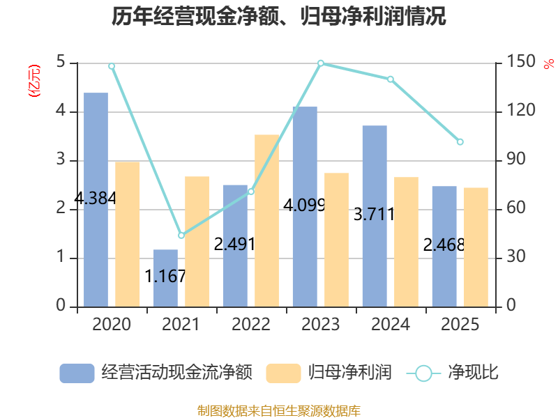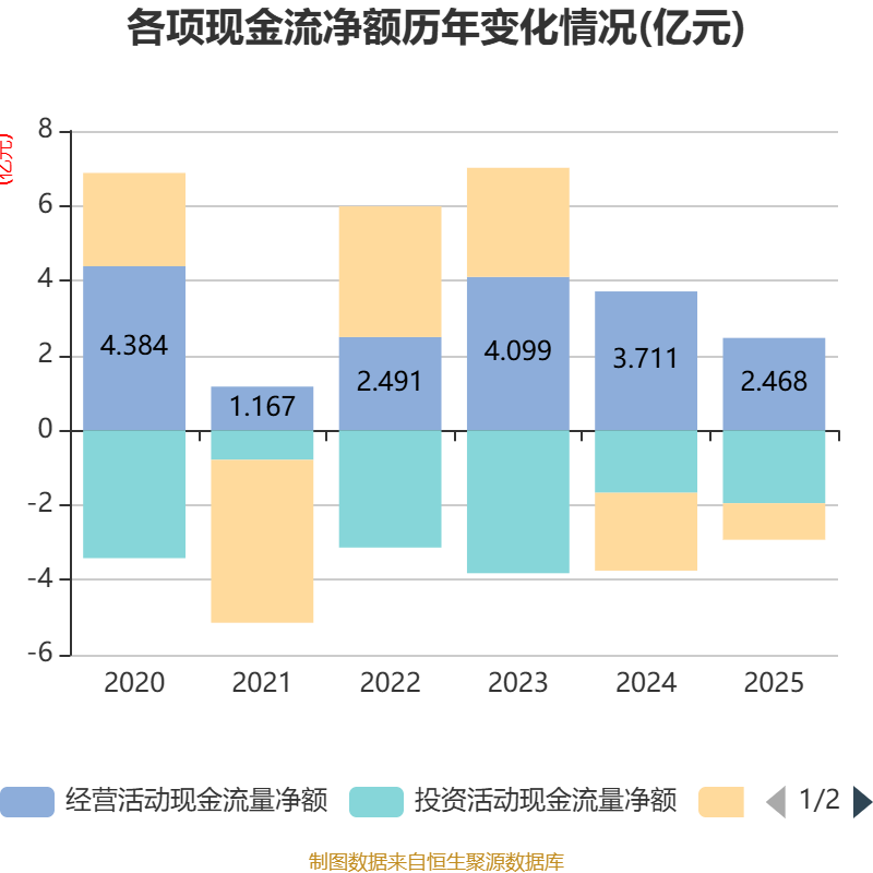 截至2025年,公司经营活动现金流净额为2.47亿元,同比下降33.51%;筹资活动现金流净额-9768万元,同比增加1.1亿元;投资活动现金流净额-1.95亿元,上年同期为-1.67亿元。