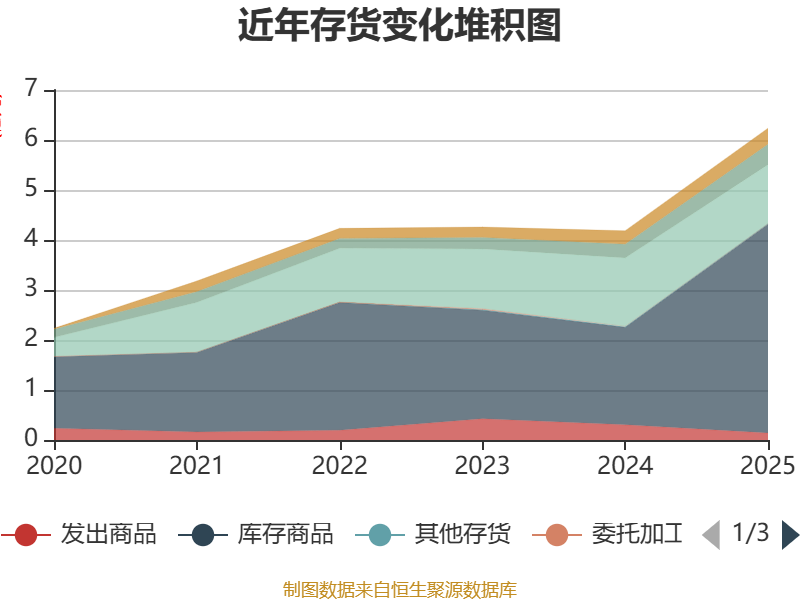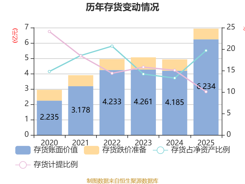 从存货变动来看,截至2025年末,公司存货账面价值为6.23亿元,占净资产的19.65%,较上年末增加2.05亿元。其中,存货跌价准备为6974.5万元,计提比例为10.06%。