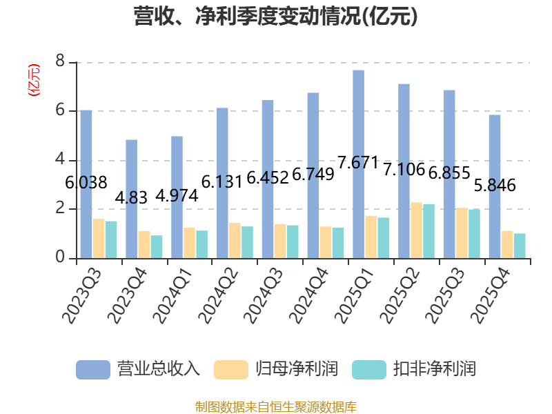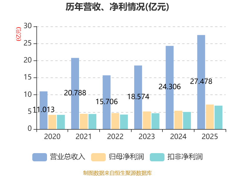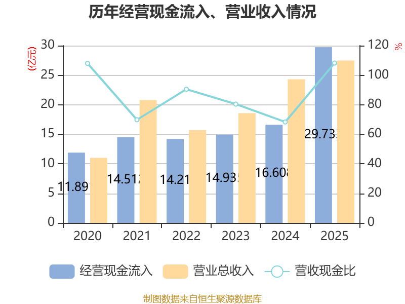 中证智能财讯军信股份(301109)3月31日披露2025年年度报告。2025年,公司实现营业总收入27.48亿元,同比增长13.05%;归母净利润7.17亿元,同比增长33.62%;扣非净利润6.85亿元,同比增长36.95%;经营活动产生的现金流量净额为16.99亿元,同比增长74.98%;报告期内,军信股份基本每股收益为0.916元,加权平均净资产收益率为9.40%。公司2025年度分配预案为:拟向全体股东每10股派现6.53元(含税)。