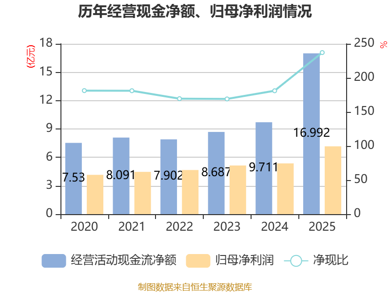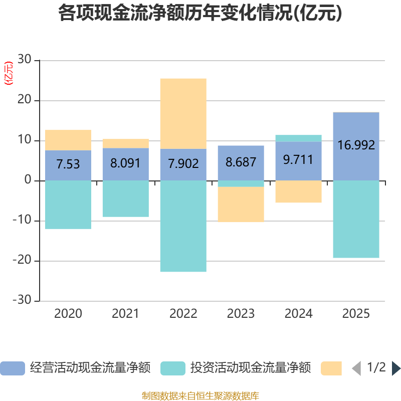 截至2025年,公司经营活动现金流净额为16.99亿元,同比增长74.98%;筹资活动现金流净额788.74万元,同比增加5.6亿元;投资活动现金流净额-19.31亿元,上年同期为1.64亿元。