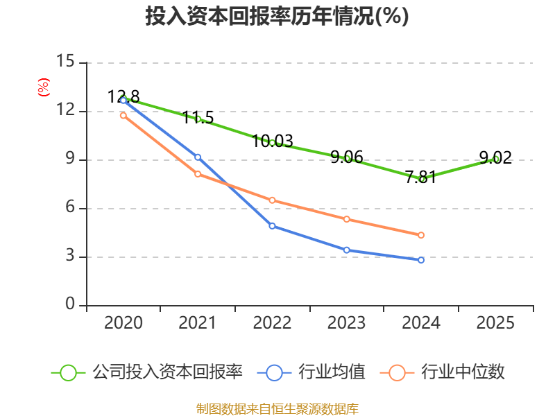 数据显示,2025年公司加权平均净资产收益率为9.4%,较上年同期下降0.85个百分点。公司2025年投入资本回报率为9.02%,较上年同期上升1.21个百分点。