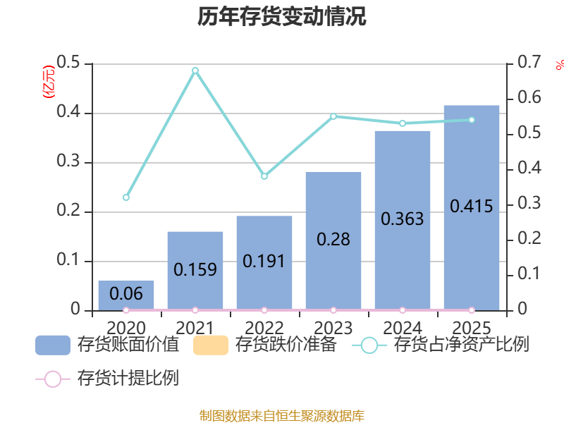 从存货变动来看,截至2025年末,公司存货账面价值为4147.33万元,占净资产的0.54%,较上年末增加518.01万元。公司本期没有计提存货跌价准备。
