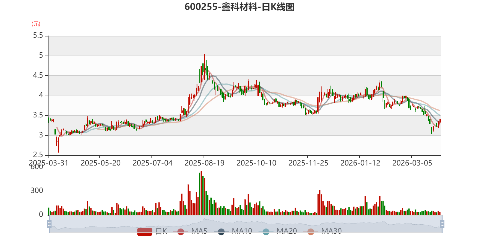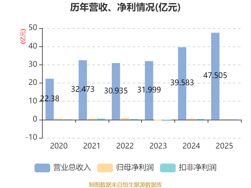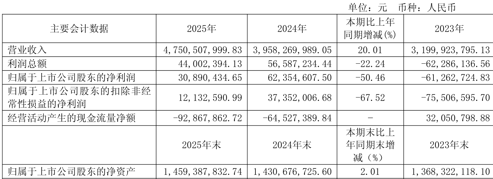 中证智能财讯鑫科材料(600255)3月31日披露2025年年度报告。2025年,公司实现营业总收入47.51亿元,同比增长20.01%;归母净利润3089.04万元,同比下降50.46%;扣非净利润1213.26万元,同比下降67.52%;经营活动产生的现金流量净额为-9286.79万元,上年同期为-6452.74万元;报告期内,鑫科材料基本每股收益为0.02元,加权平均净资产收益率为2.14%。