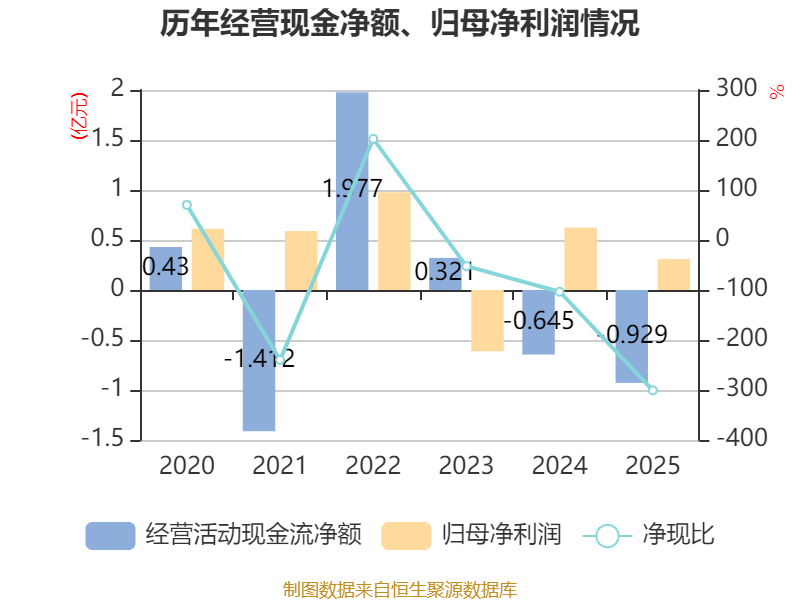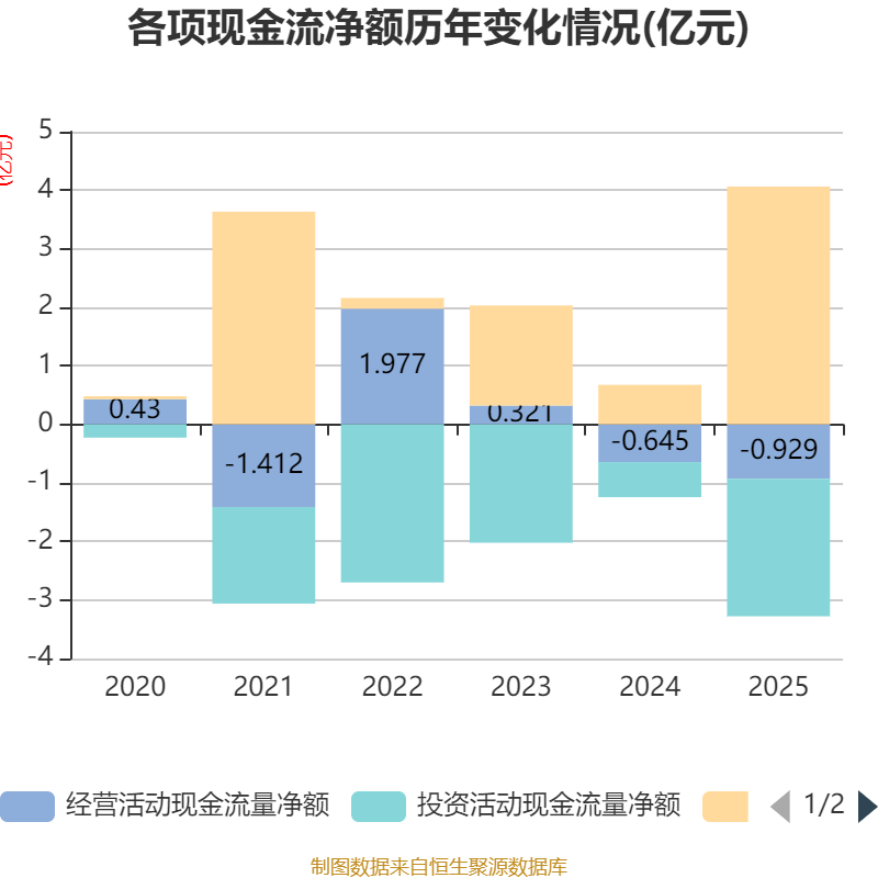 截至2025年,公司经营活动现金流净额为-9286.79万元,同比减少2834.05万元;筹资活动现金流净额4.06亿元,同比增加3.39亿元;投资活动现金流净额-2.35亿元,上年同期为-5989.45万元。