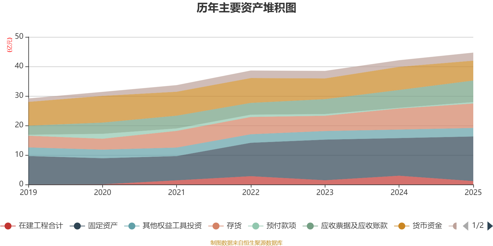 资产重大变化方面,截至2025年末,公司在建工程合计较上年末减少61.39%,占公司总资产比重下降4.49个百分点;固定资产较上年末增加18.57%,占公司总资产比重上升3.56个百分点;货币资金较上年末减少14.15%,占公司总资产比重下降3.55个百分点;应收票据及应收账款较上年末增加20.64%,占公司总资产比重上升1.97个百分点。