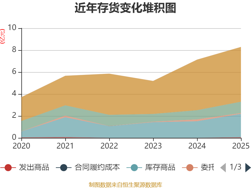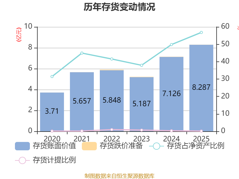 从存货变动来看,截至2025年末,公司存货账面价值为8.29亿元,占净资产的56.79%,较上年末增加1.16亿元。其中,存货跌价准备为96.93万元,计提比例为0.12%。