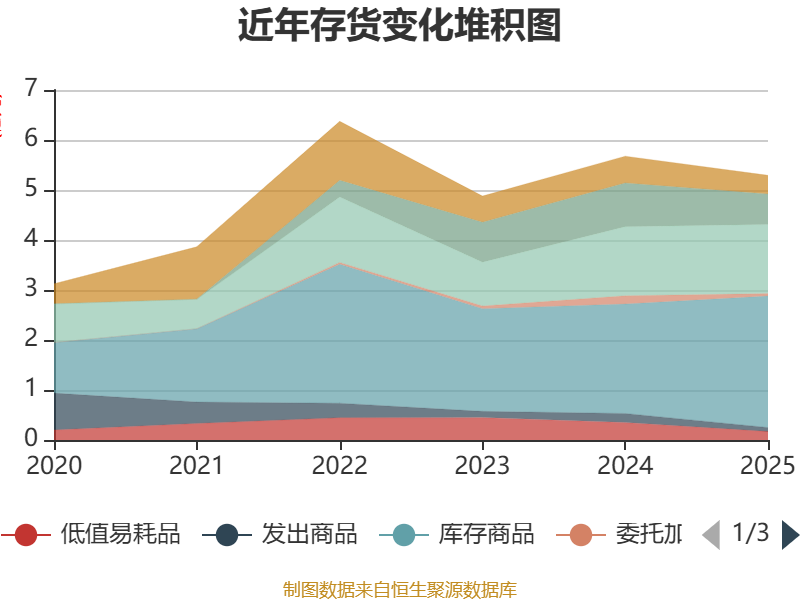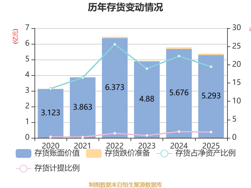 从存货变动来看,截至2025年末,公司存货账面价值为5.29亿元,占净资产的19.46%,较上年末减少3824.79万元。其中,存货跌价准备为857.92万元,计提比例为1.59%。