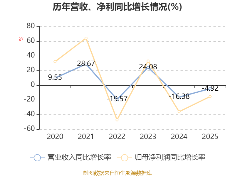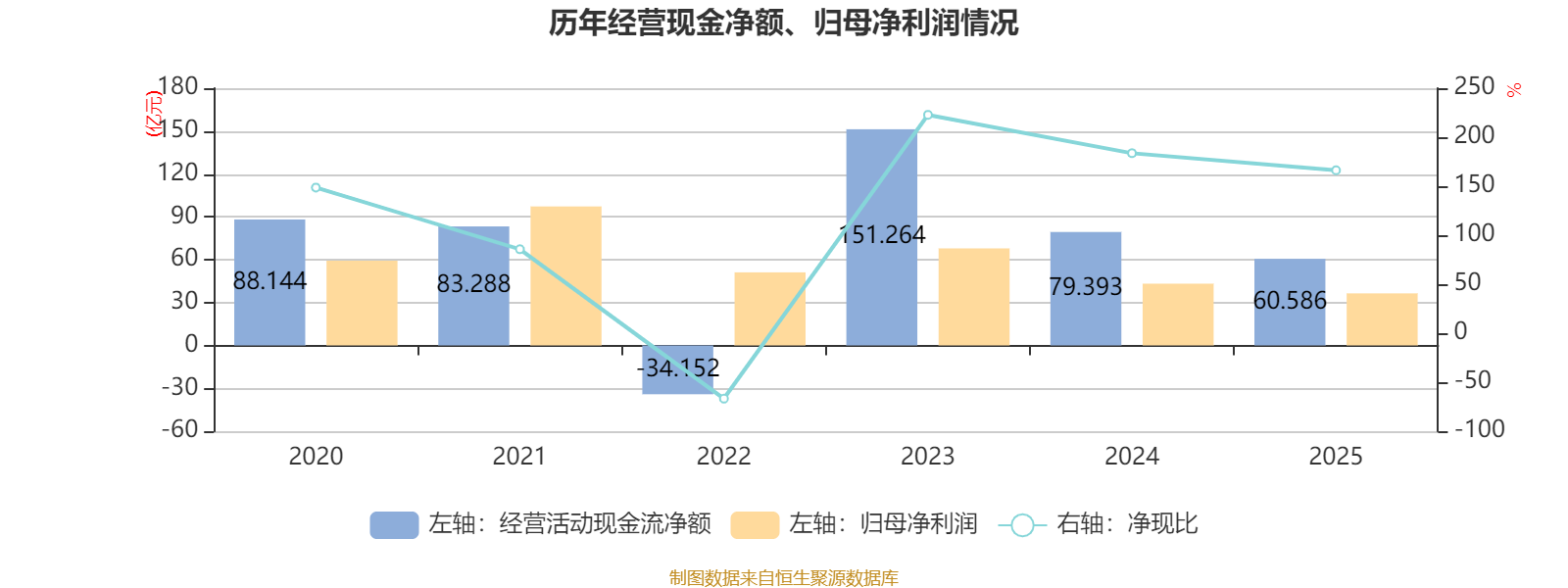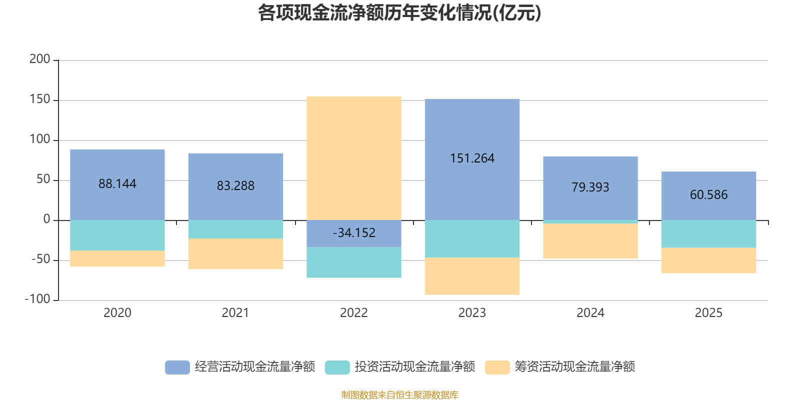 2025年,公司经营活动现金流净额为60.59亿元,同比下降23.69%;筹资活动现金流净额-31.82亿元,同比增加11.85亿元;投资活动现金流净额-34.8亿元,上年同期为-4.54亿元。