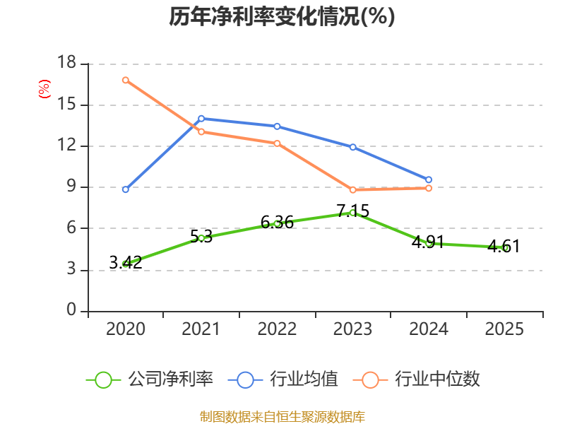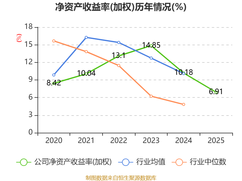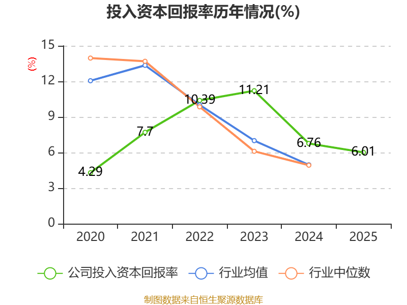 数据显示,2025年公司加权平均净资产收益率为6.91%,较上年同期下降3.27个百分点。公司2025年投入资本回报率为6.01%,较上年同期下降0.75个百分点。