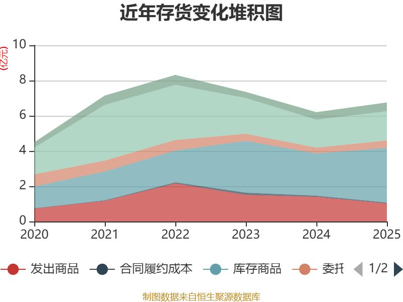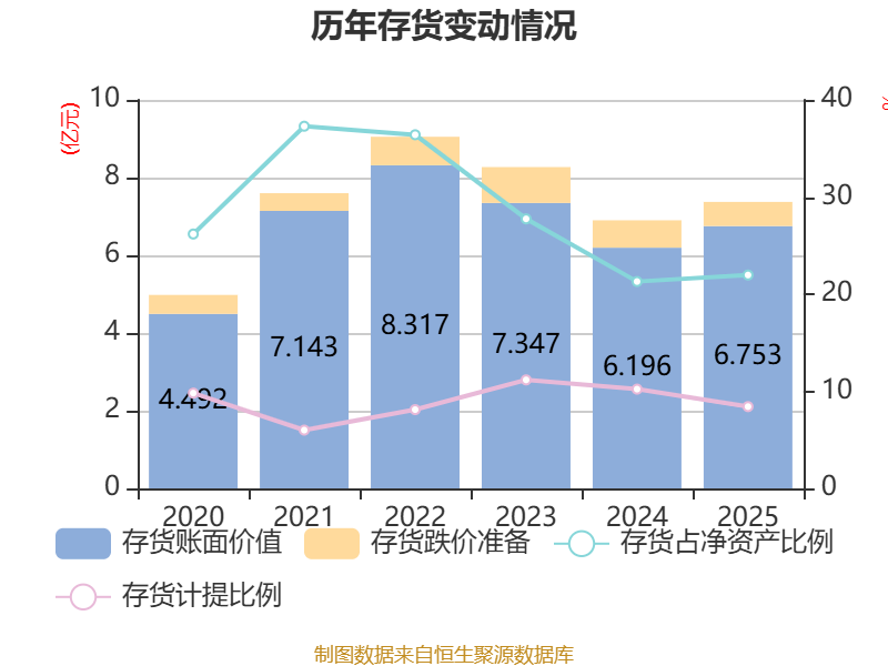 从存货变动来看,截至2025年末,公司存货账面价值为6.75亿元,占净资产的21.97%,较上年末增加5564.53万元。其中,存货跌价准备为6205.7万元,计提比例为8.42%。