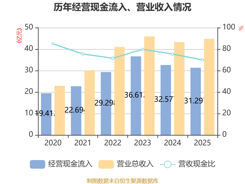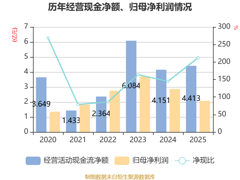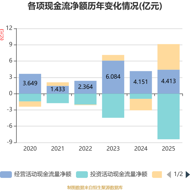 截至2025年,公司经营活动现金流净额为4.41亿元,同比增长6.3%;筹资活动现金流净额4.71亿元,同比增加6.82亿元;投资活动现金流净额-8.4亿元,上年同期为-9610.26万元。