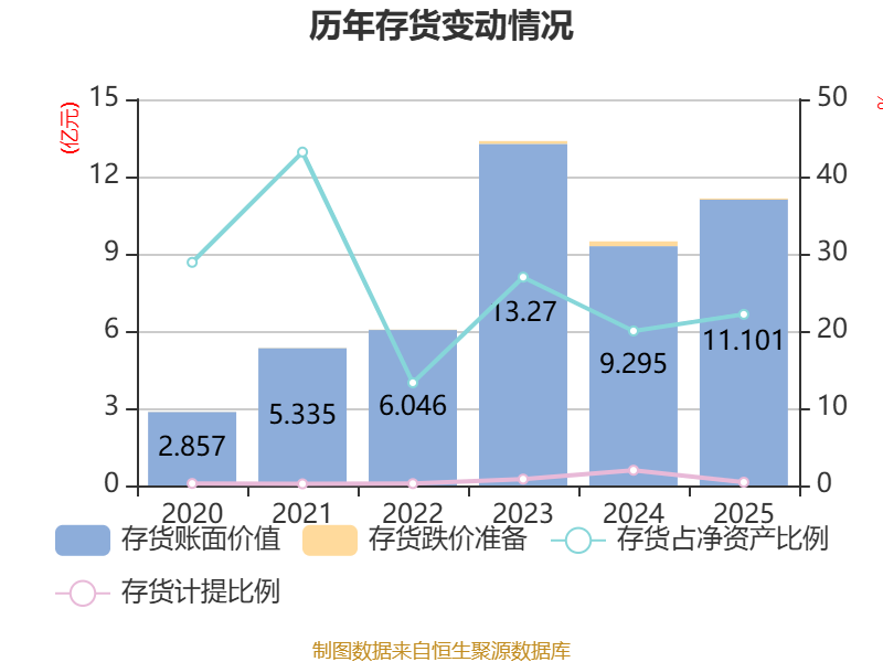 从存货变动来看,截至2025年末,公司存货账面价值为11.1亿元,占净资产的22.16%,较上年末增加1.81亿元。其中,存货跌价准备为464.03万元,计提比例为0.42%。