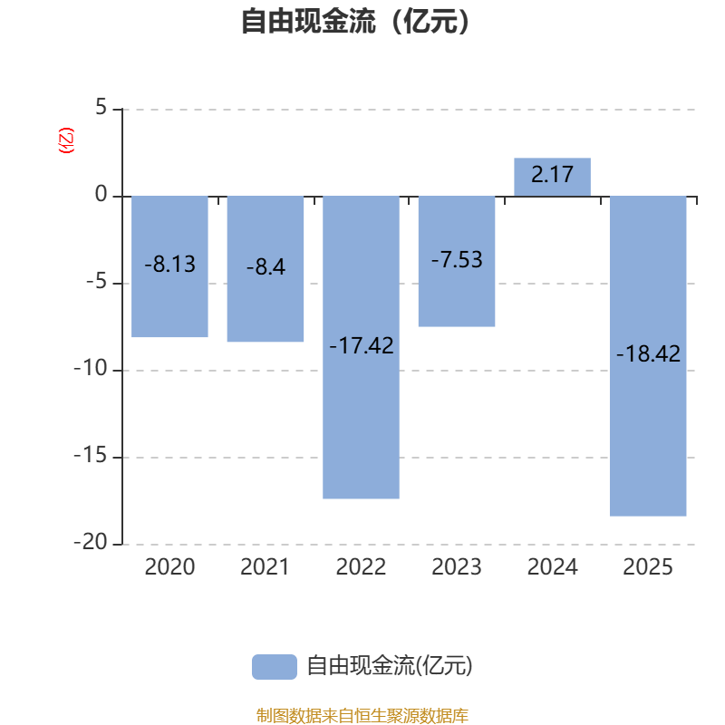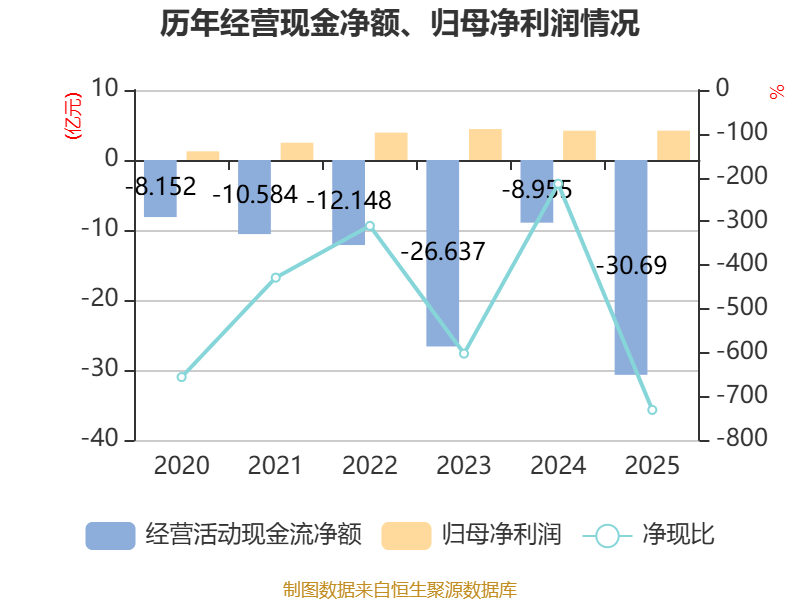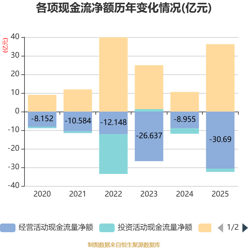 截至2025年,公司经营活动现金流净额为-30.69亿元,同比减少21.73亿元;筹资活动现金流净额36.25亿元,同比增加25.66亿元;投资活动现金流净额-1.73亿元,上年同期为-2.96亿元。