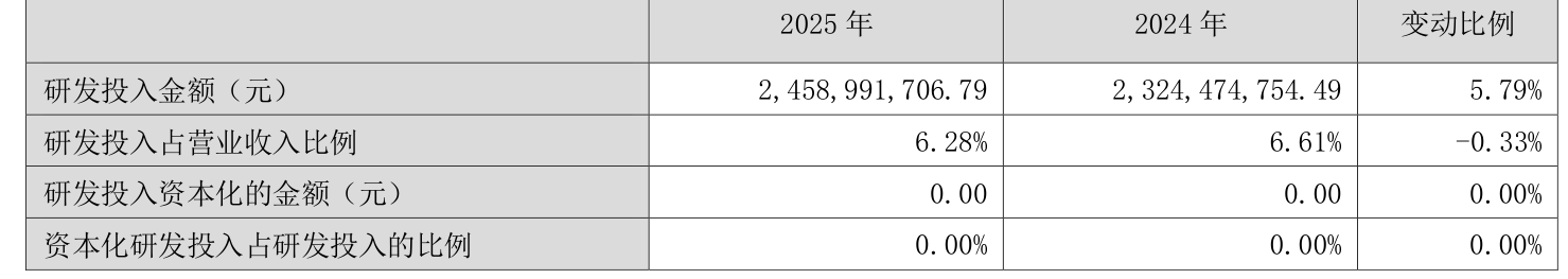 2025年全年,公司研发投入金额为24.59亿元,同比增长5.79%;研发投入占营业收入比例为6.28%,相比上年同期下降0.33个百分点。此外,公司全年研发投入资本化率为0%。
