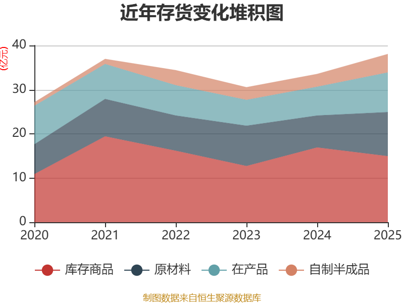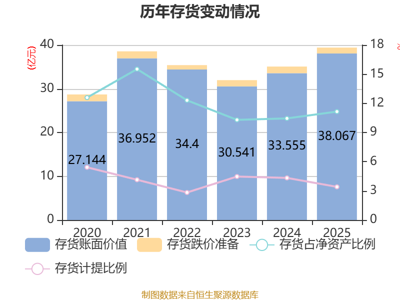 从存货变动来看,截至2025年末,公司存货账面价值为38.07亿元,占净资产的11.15%,较上年末增加4.51亿元。其中,存货跌价准备为1.34亿元,计提比例为3.41%。