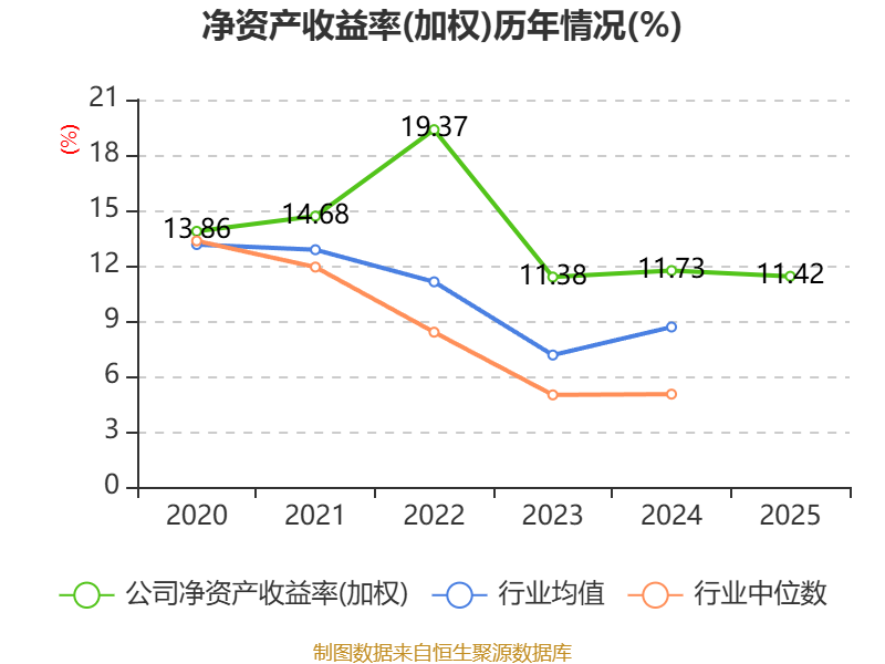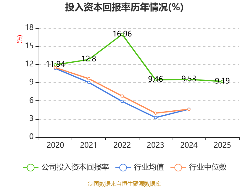 数据显示,2025年公司加权平均净资产收益率为11.42%,较上年同期下降0.31个百分点。公司2025年投入资本回报率为9.19%,较上年同期下降0.34个百分点。
