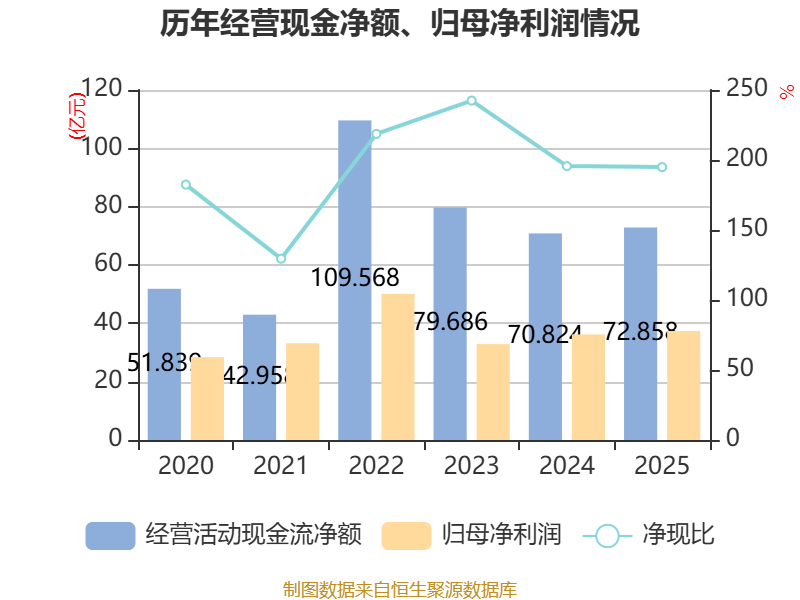 截至2025年,公司经营活动现金流净额为72.86亿元,同比增长2.87%;筹资活动现金流净额-14.47亿元,同比增加3.81亿元;投资活动现金流净额-71.45亿元,上年同期为-28.86亿元。