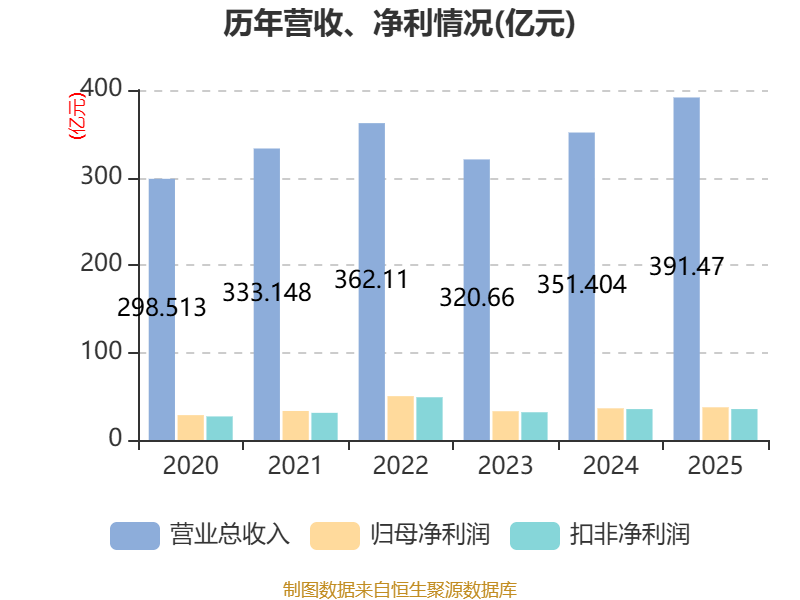 中证智能财讯鹏鼎控股(002938)3月31日披露2025年年度报告。2025年,公司实现营业总收入391.47亿元,同比增长11.40%;归母净利润37.38亿元,同比增长3.25%;扣非净利润35.34亿元,同比增长0.08%;经营活动产生的现金流量净额为72.86亿元,同比增长2.87%;报告期内,鹏鼎控股基本每股收益为1.61元,加权平均净资产收益率为11.42%。公司2025年度分配预案为:拟向全体股东每10股派现10元(含税)。