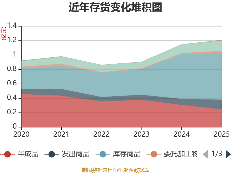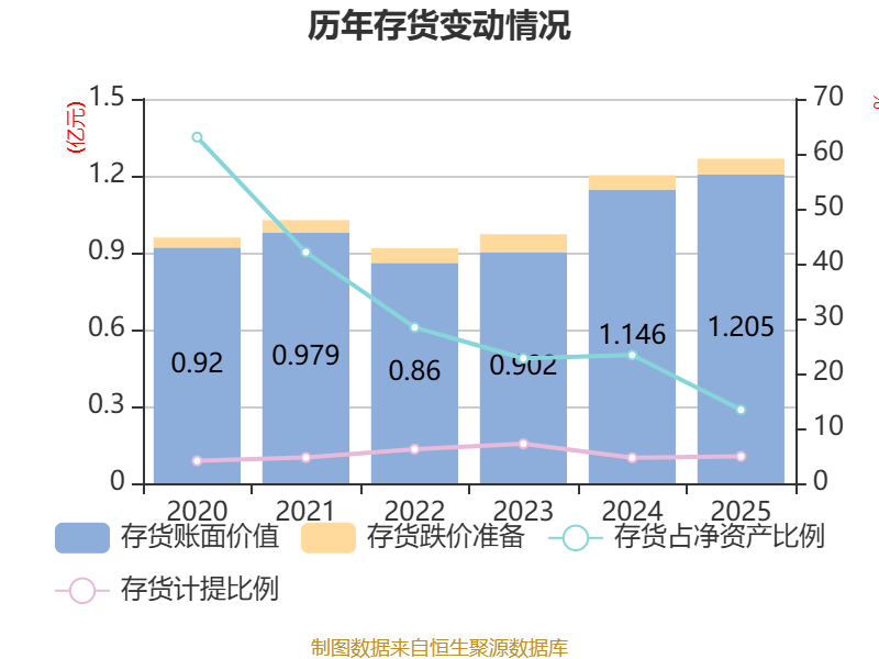 从存货变动来看,截至2025年末,公司存货账面价值为1.21亿元,占净资产的13.37%,较上年末增加586.41万元。其中,存货跌价准备为618.39万元,计提比例为4.88%。