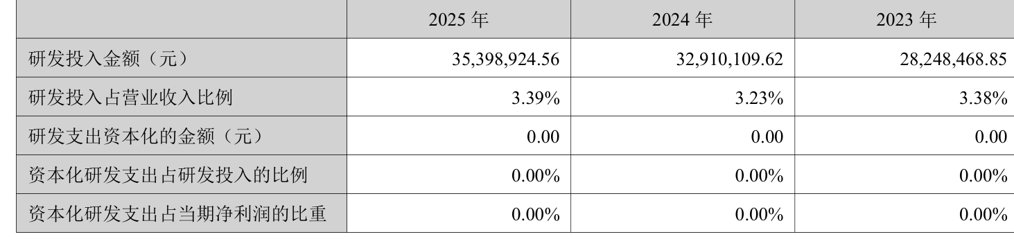 2025年全年,公司研发投入金额为3539.89万元,同比增长7.56%;研发投入占营业收入比例为3.39%,相比上年同期上升0.16个百分点。此外,公司全年研发投入资本化率为0%。