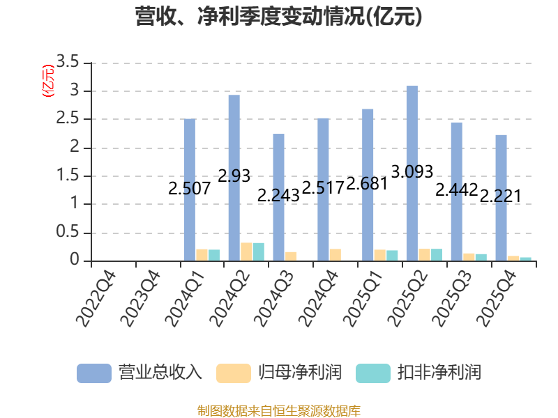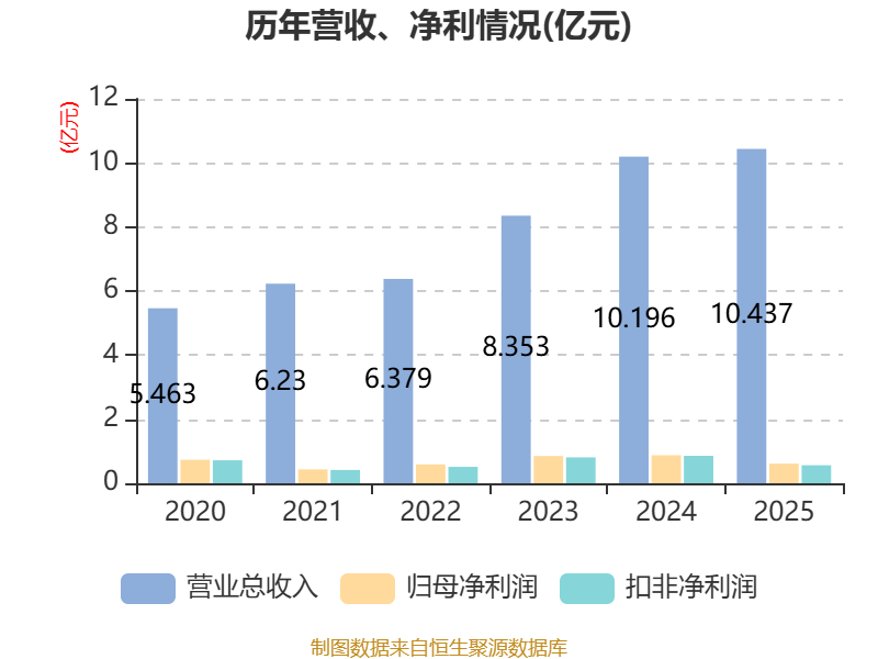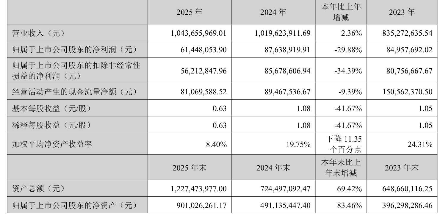 中证智能财讯太力科技(301595)3月31日披露2025年年度报告。2025年,公司实现营业总收入10.44亿元,同比增长2.36%;归母净利润6144.81万元,同比下降29.88%;扣非净利润5621.28万元,同比下降34.39%;经营活动产生的现金流量净额为8106.96万元,同比下降9.39%;报告期内,太力科技基本每股收益为0.63元,加权平均净资产收益率为8.40%。公司2025年度分配预案为:拟向全体股东每10股派现2.5元(含税)。