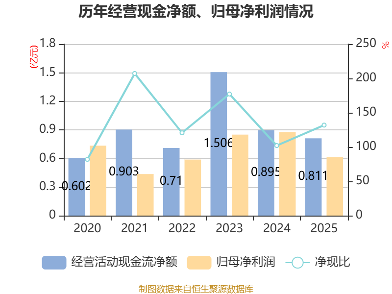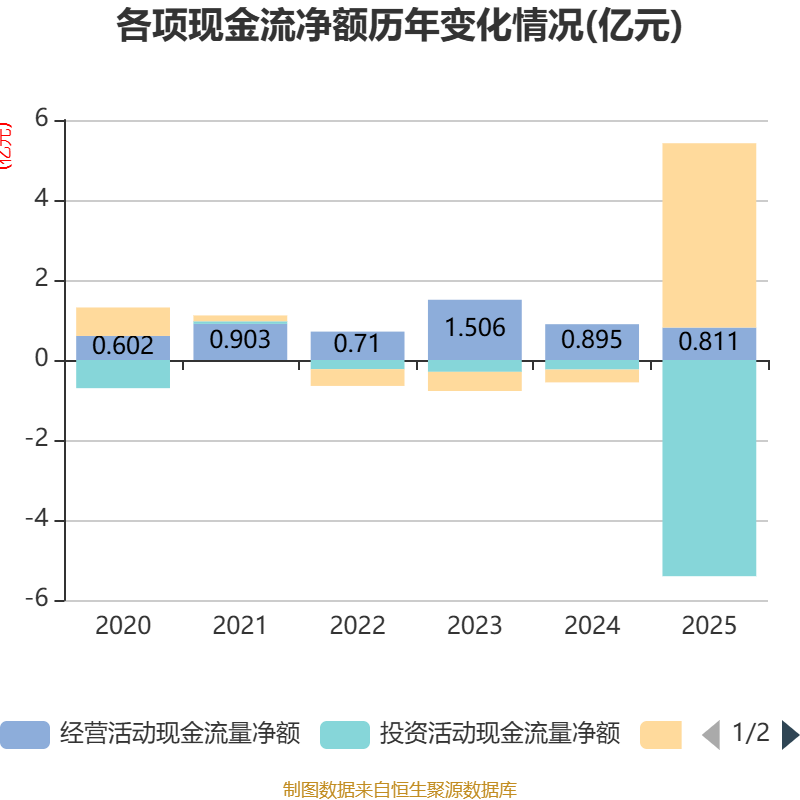 截至2025年,公司经营活动现金流净额为8106.96万元,同比下降9.39%;筹资活动现金流净额4.61亿元,同比增加4.93亿元;投资活动现金流净额-5.4亿元,上年同期为-2389.03万元。