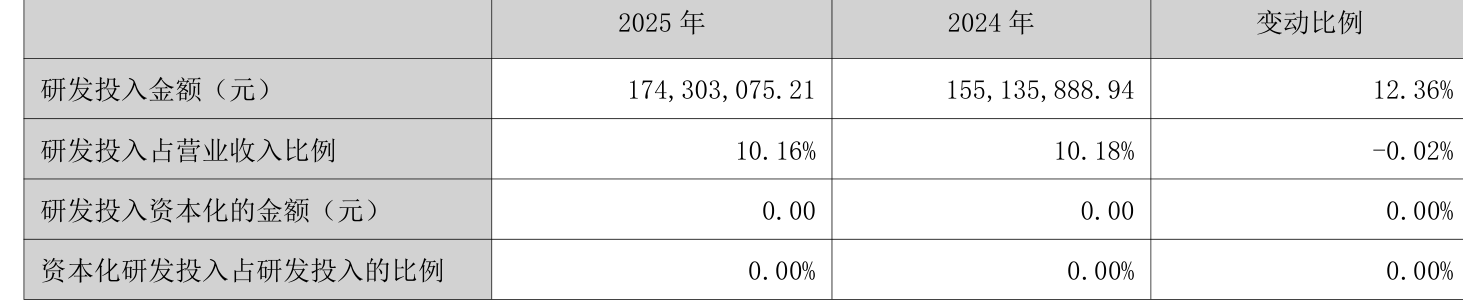 2025年全年,公司研发投入金额为1.74亿元,同比增长12.36%;研发投入占营业收入比例为10.16%,相比上年同期下降0.02个百分点。此外,公司全年研发投入资本化率为0%。