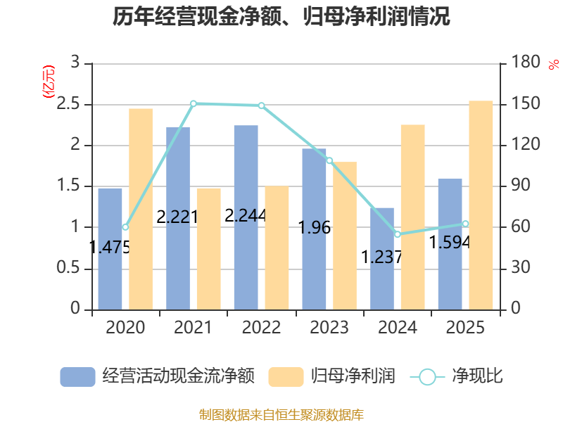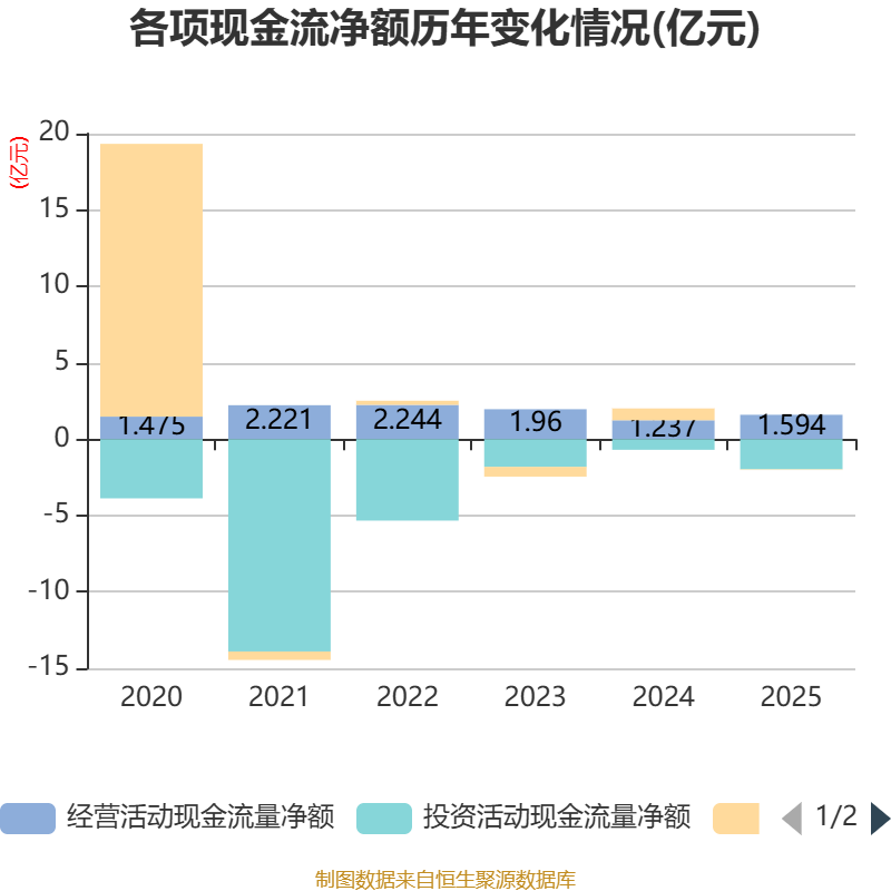 截至2025年,公司经营活动现金流净额为1.59亿元,同比增长28.89%;筹资活动现金流净额-305.52万元,同比减少8038.55万元;投资活动现金流净额-1.97亿元,上年同期为-6978.12万元。