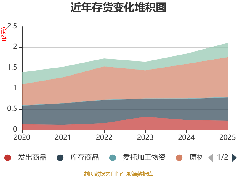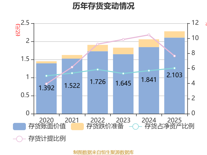 从存货变动来看,截至2025年末,公司存货账面价值为2.1亿元,占净资产的6.04%,较上年末增加2615.22万元。其中,存货跌价准备为1744.92万元,计提比例为7.66%。