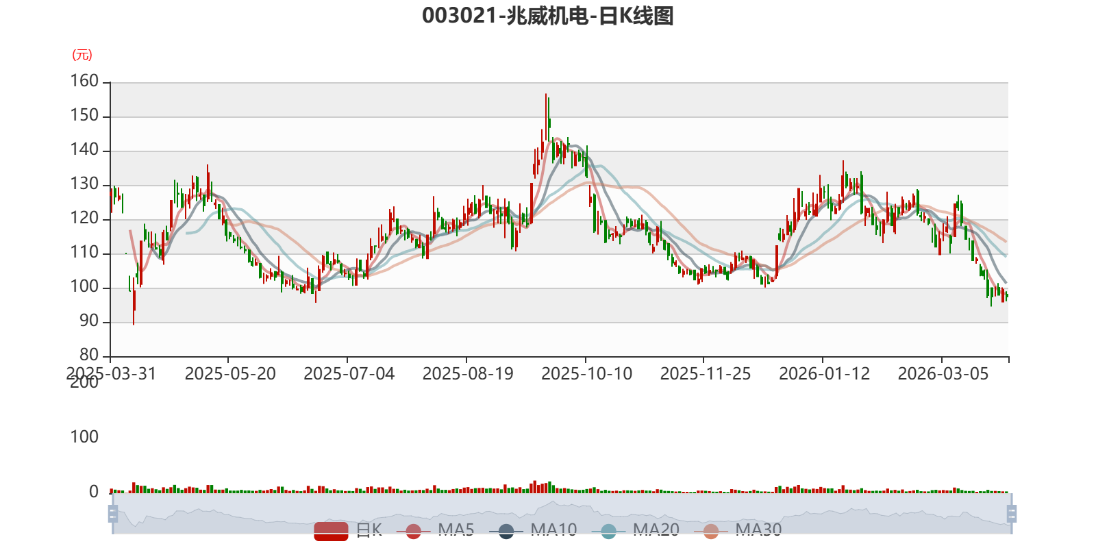 以3月30日收盘价计算,兆威机电目前市盈率(TTM)约为102.44倍,市净率(LF)约7.48倍,市销率(TTM)约15.18倍。