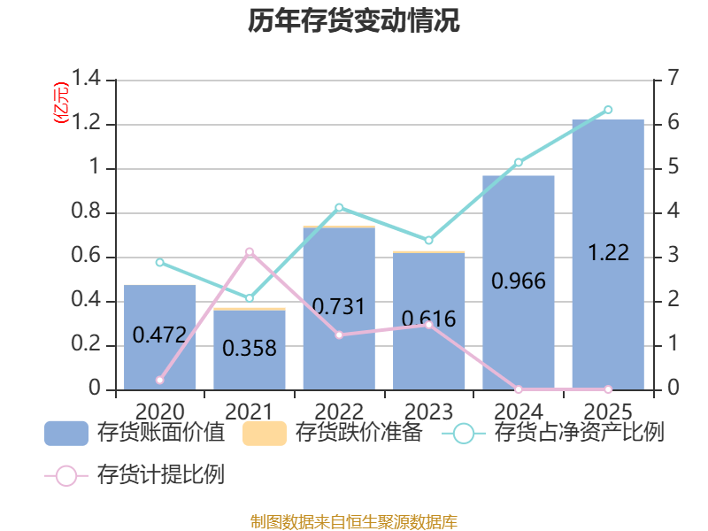 从存货变动来看,截至2025年末,公司存货账面价值为1.22亿元,占净资产的6.32%,较上年末增加2544.91万元。公司本期没有计提存货跌价准备。