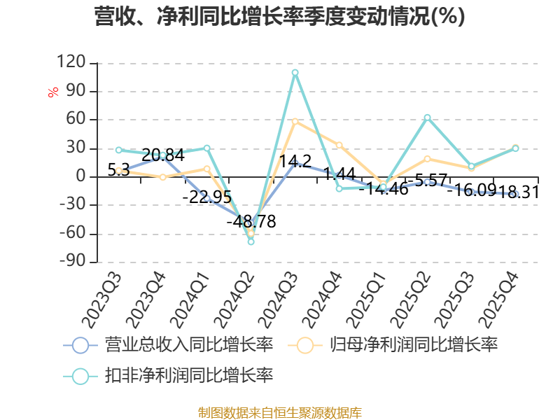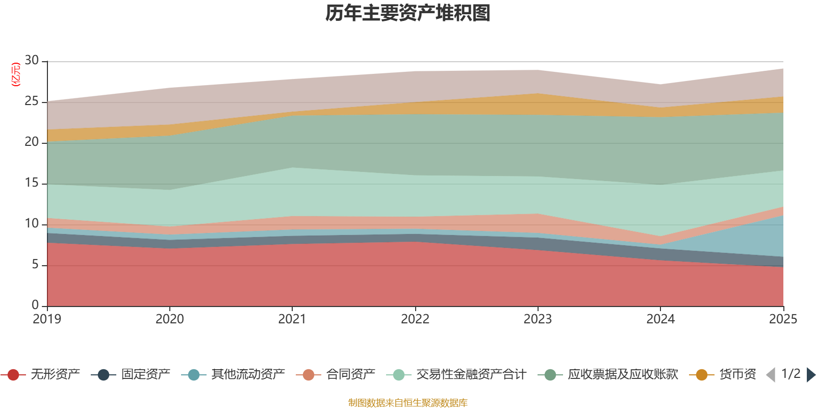 资产重大变化方面,截至2025年末,公司其他流动资产较上年末增加965.6%,占公司总资产比重上升15.7个百分点;交易性金融资产合计较上年末减少29.6%,占公司总资产比重下降7.94个百分点;应收票据及应收账款较上年末减少14.57%,占公司总资产比重下降6.18个百分点;无形资产较上年末减少15.14%,占公司总资产比重下降4.27个百分点。