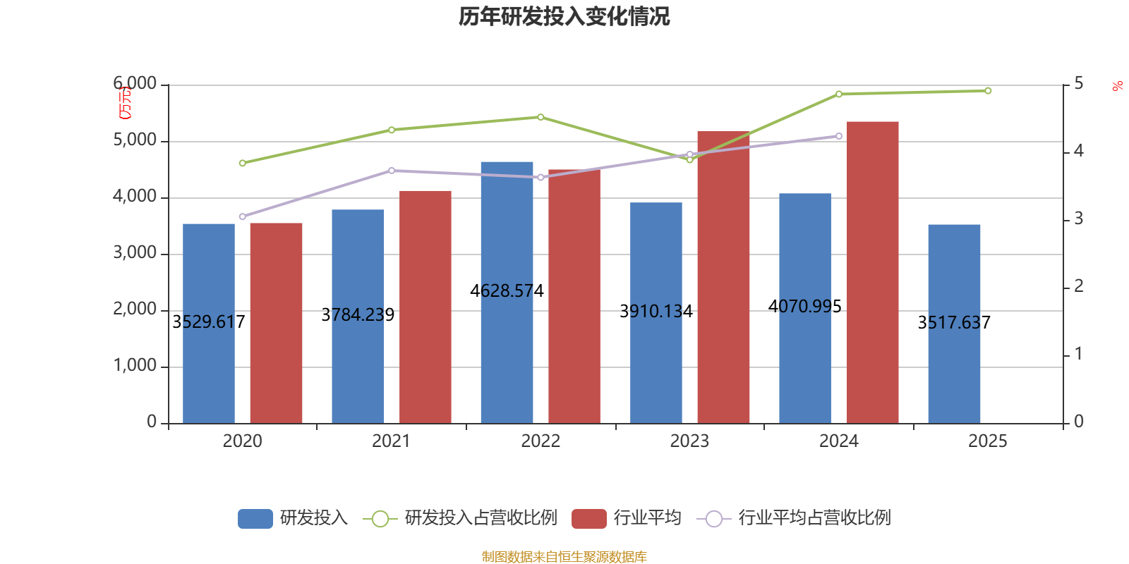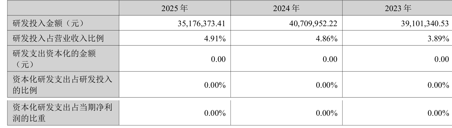 2025年全年,公司研发投入金额为3517.64万元,同比下降13.59%;研发投入占营业收入比例为4.91%,相比上年同期上升0.05个百分点。此外,公司全年研发投入资本化率为0%。