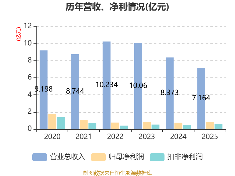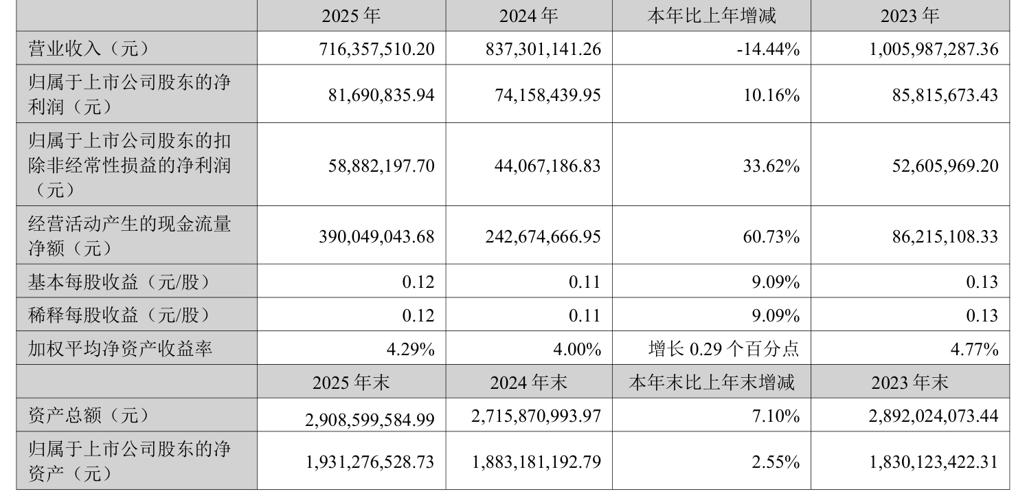 中证智能财讯中电环保(300172)3月31日披露2025年年度报告。2025年,公司实现营业总收入7.16亿元,同比下降14.44%;归母净利润8169.08万元,同比增长10.16%;扣非净利润5888.22万元,同比增长33.62%;经营活动产生的现金流量净额为3.9亿元,同比增长60.73%;报告期内,中电环保基本每股收益为0.12元,加权平均净资产收益率为4.29%。公司2025年度分配预案为:拟向全体股东每10股派现1元(含税)。