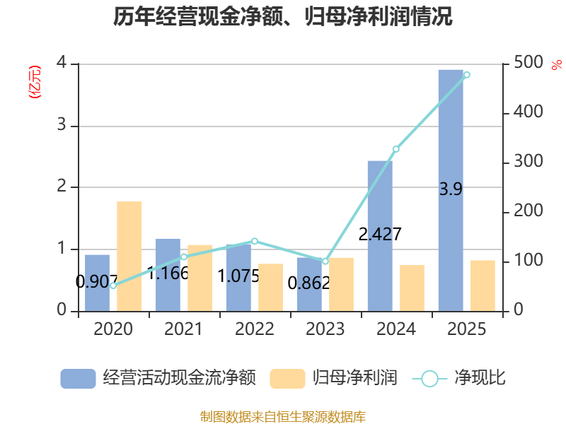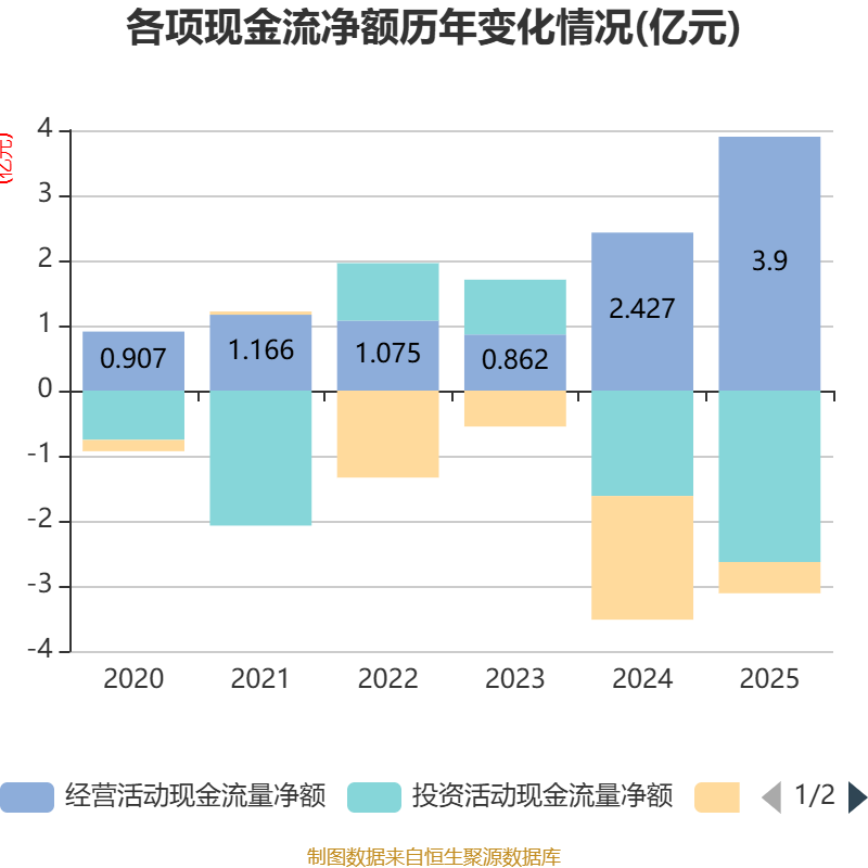 截至2025年,公司经营活动现金流净额为3.9亿元,同比增长60.73%;筹资活动现金流净额-4796.65万元,同比增加1.42亿元;投资活动现金流净额-2.63亿元,上年同期为-1.62亿元。