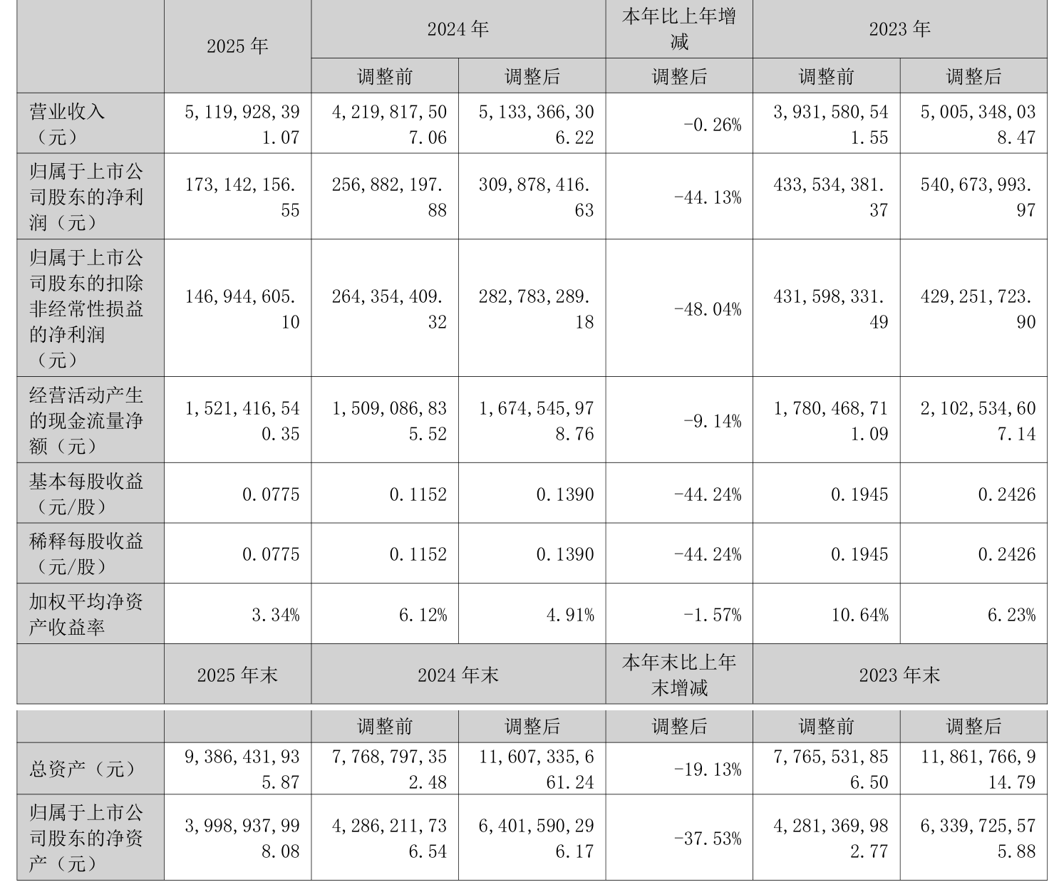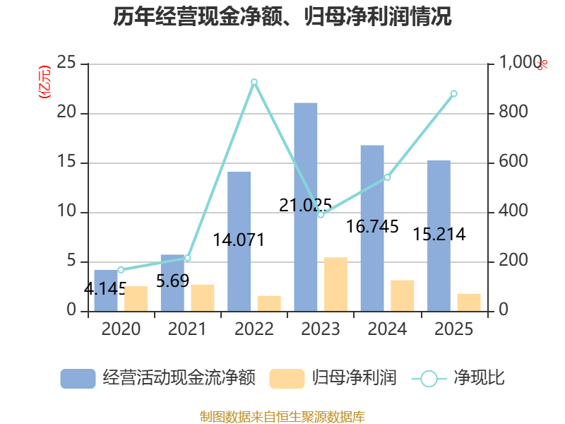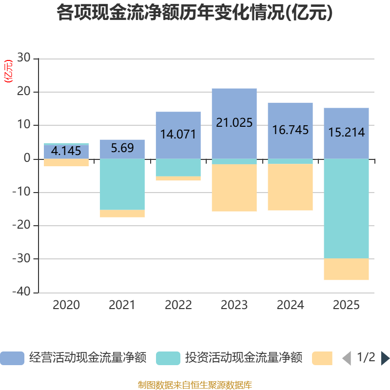 截至2025年,公司经营活动现金流净额为15.21亿元,同比下降9.14%;筹资活动现金流净额-6.44亿元,同比增加7.44亿元;投资活动现金流净额-29.8亿元,上年同期为-1.55亿元。