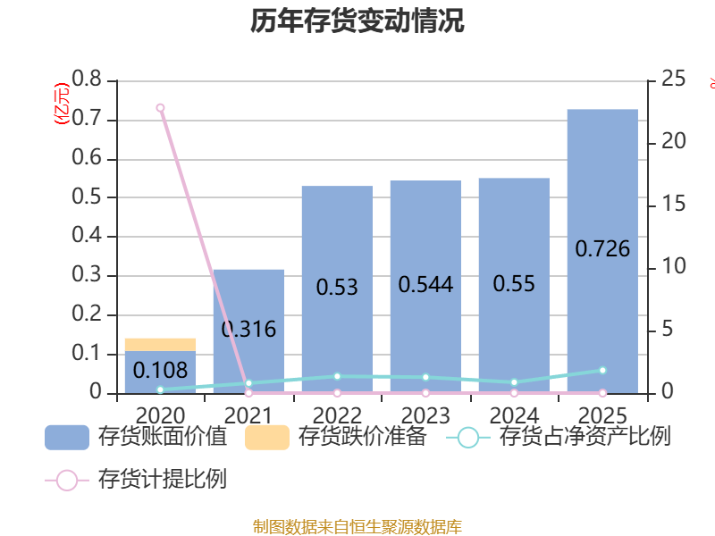 从存货变动来看,截至2025年末,公司存货账面价值为7262.46万元,占净资产的1.82%,较上年末增加1762.89万元。公司本期没有计提存货跌价准备。