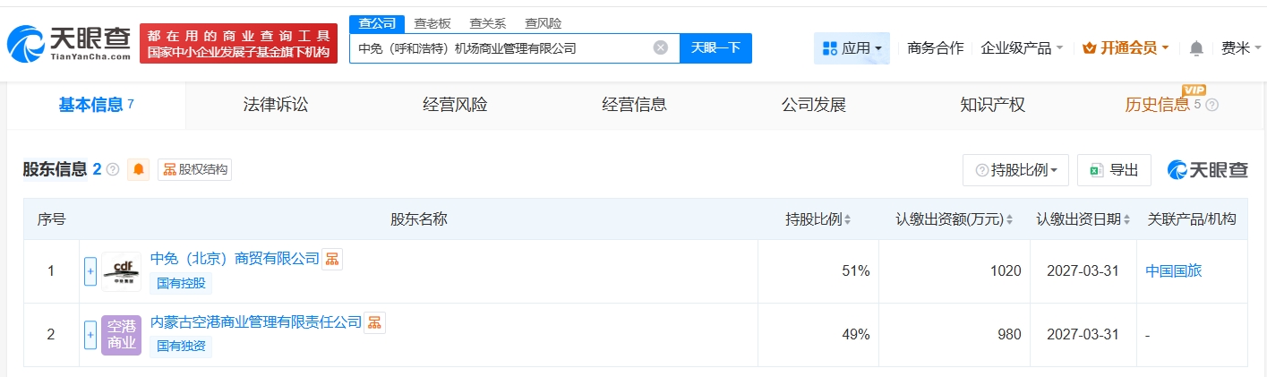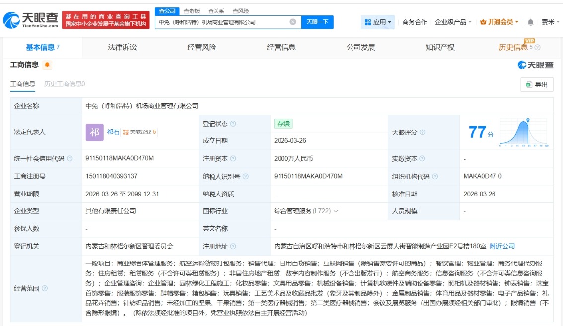 南方财经3月31日电,天眼查App显示,近日,中免(呼和浩特)机场商业管理有限公司成立,法定代表人为祁石,注册资本2000万人民币,经营范围包括商业综合体管理服务、航空运输货物打包服务、销售代理等,由中免(北京)商贸有限公司、内蒙古空港商业管理有限责任公司共同持股。